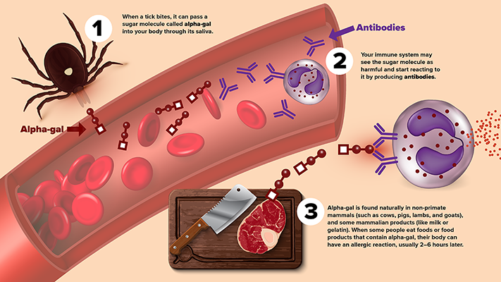 - When a tick bites, it can pass a sugar molecule called alpha-gal into your body through its saliva.