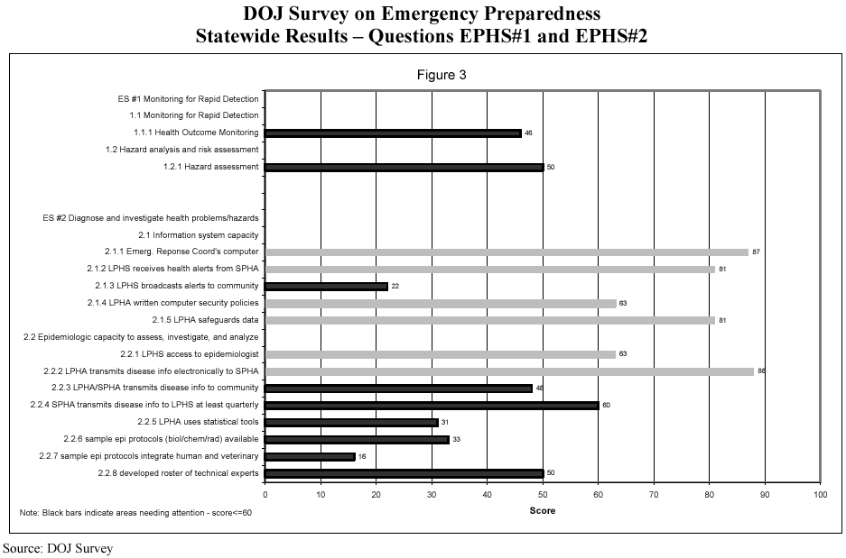 Results from the DOJ Survey on Emergency Preparedness regarding questions on the modified Essential Public Health Services # 1 and Essential Public Health Services # 2 are presented in Figure 3 on a separate page.